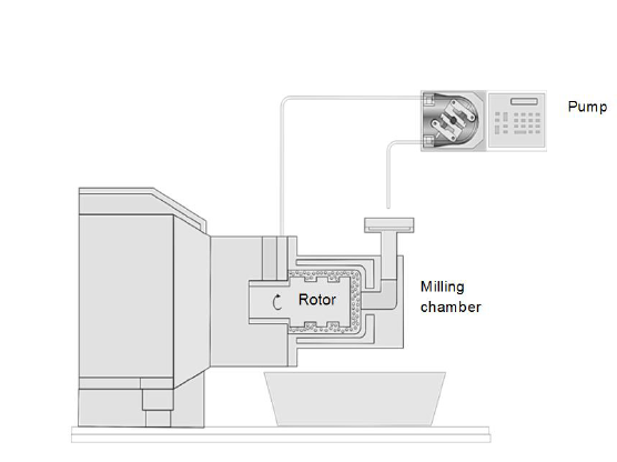 The suspension, consisting of coarse drug particles and stabiliser solution, is kept in a closed vessel together with the milling beads. The suspension has to be separated from the beads after milling. Therefore, the Dispermat® has a dynamic gap between milling vessel and outlet for circulation purposes. Particles in suspension are able to pass this gap while milling beads stay in the milling chamber. Hence, an automated separation of beads and product is achieved more easily when comparing the bead separation process to, for example, a planetary mill, where the beads have to be manually removed. Starting material that gets in between bead–bead, bead-wall and bead-rotor contacts is exposed to a certain force, depending on the nature of the contact, so that depending on the rotor speed, milling time and bead size, different particle sizes can be produced.