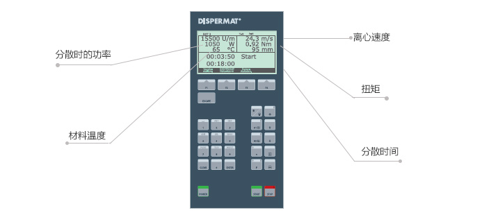 通過C工藝控制面板上的顯示屏幕可全方位的顯示測試過程中的相關(guān)參數(shù),如轉(zhuǎn)速、扭矩、樣品溫度、計時以及分散盤的高度等。