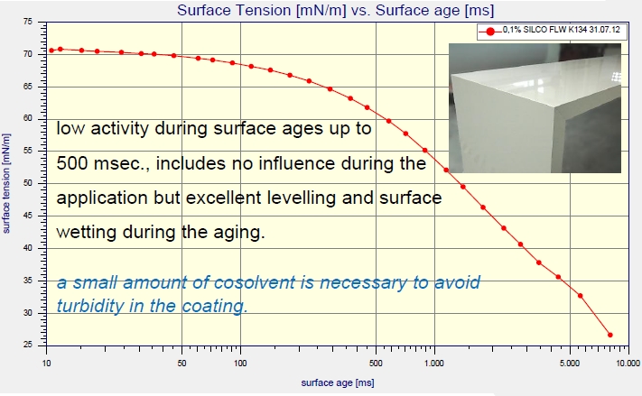 上圖為某品牌0.1%流平劑水溶液,在500ms氣泡壽命以內(nèi)的表活遷移速度很慢,對涂布時潤濕沒有影響。 在500ms以上的氣泡壽命,表面張力下降很快。在實際應(yīng)用中,流平時可以達(dá)到很好的效果。