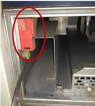 4、 此時,那就可能是燈盒門的門鎖開關導致故障出現(xiàn),此時我們打開燈盒門,然后可以看到在左側有一個紅色的模塊,那就是門鎖開關,我們可以擰松門鎖開關下面的四顆螺絲,直到M2報警信息消除,這樣我們就可以讓門鎖開關失效,進行下一步測試,但如果M2沒法消除,則表明門鎖開關有可能損壞,需要更換。