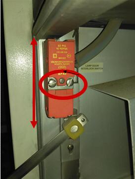 5、 當M2信息消除后,我們要把燈盒門關閉,一定要確保關閉,由于燈管啟動電壓是800V,所以要確保燈盒門關閉好。運行儀器,看儀器是否可以點亮燈管。如果能,則表明故障是由于門鎖開關接觸不良引起的,我們需要調整門鎖開關的位置,使到其可以接觸良好,通過擰松右圖中的螺絲,就可以上下移動門鎖開關,不斷地調整位置,就可以讓門鎖開關接觸好。PS:記住在調整之前要先把之前擰松的四顆螺絲擰緊,以便讓門鎖開關生效。