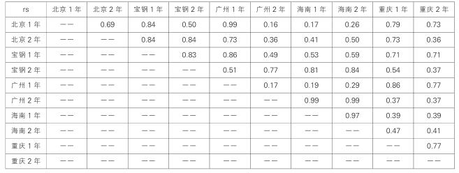 通過(guò)觀察表 5 中的數(shù)據(jù),我們發(fā)現(xiàn),戶(hù)外曝曬之間的相關(guān)系數(shù)不是很好。 即使是同一地區(qū),曝曬 1 年和曝曬 2 年的試驗(yàn)結(jié)果之間的相關(guān)性也不全是好的,其中廣州 1 年與廣州 2 年之間的相關(guān)系數(shù)只有 0.17 。 不同地區(qū)之間的相關(guān)系數(shù)更是不理想,尤其是海南 1 年、海南 2 年與其它地區(qū)之間的相關(guān)系數(shù)。