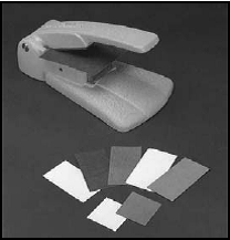 使用選購的的Triple Cut Specimen Shear樣品裁切器(圖3),可以精確的將0.020英寸厚度以下的紙、塑料、金屬片和箔裁切成均一尺寸(1 1/2 X 2 3/4英寸或者1 1/2 X 1 1/2英寸)。將材料直接放到裁切器的刻度端然后快速壓下手柄即可。