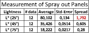 同樣,打樣過程也會是樣品顏色產(chǎn)生偏離,特別是金屬涂料。以下表格是干膜和濕膜樣品之間重復(fù)性測試(3個樣品,每個測試4次)的對比,結(jié)果顯示,Q-Chain® LCM液體涂料色漿測色系統(tǒng)測得的結(jié)果遠比干膜的好。