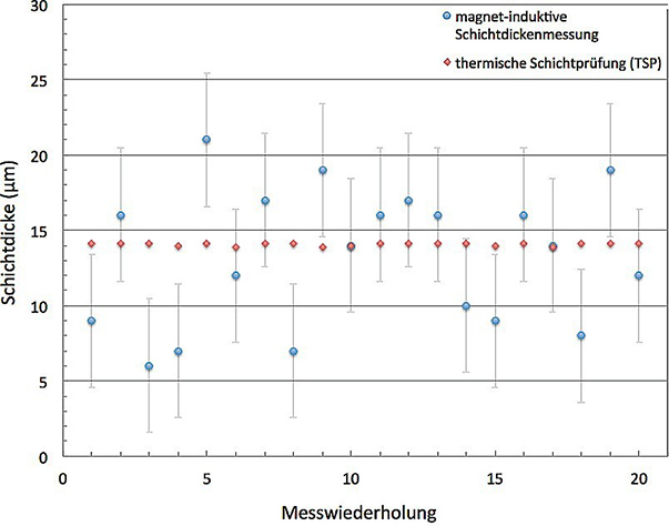傳統(tǒng)磁感應(yīng)方法與Coatmaster熱層法的涂層厚度對比,測試在測量中的振動(dòng)阻尼環(huán)上進(jìn)行確定