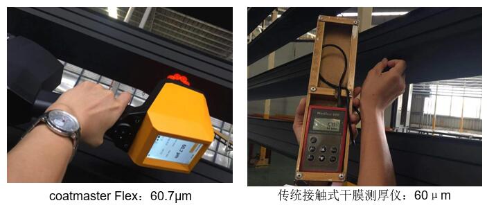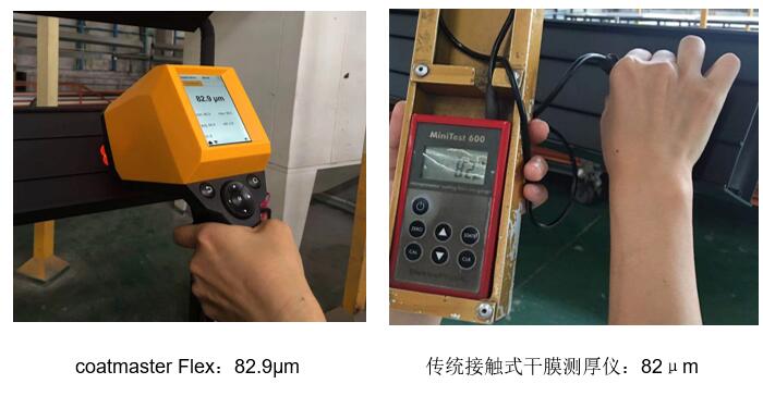 用戶得知手持非接觸膜厚分析儀coatmaster flex可以檢測固化前濕膜厚度后,使用該膜厚分析儀與干膜測厚儀進(jìn)行對比測試,發(fā)現(xiàn)對鋁型材上相同位置測試數(shù)據(jù)接近,且coatmaster Flex重復(fù)性和精度更好;