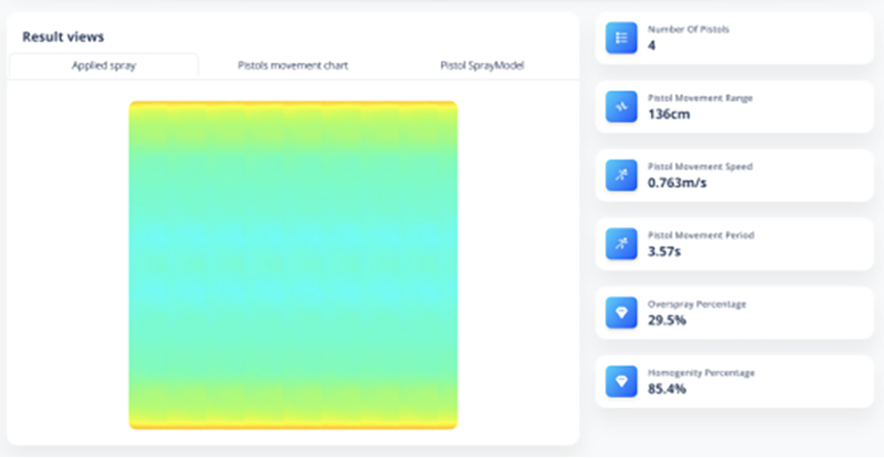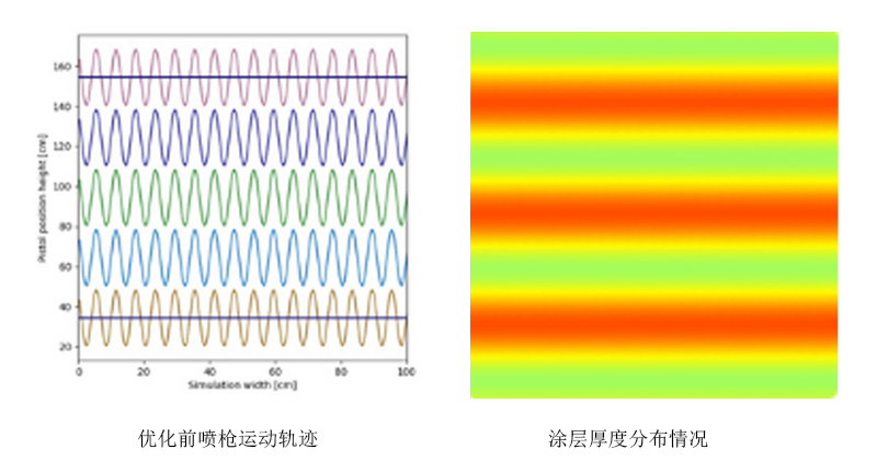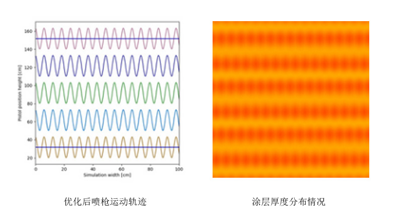 下圖是結(jié)果顯示界面,軟件幾分鐘內(nèi)優(yōu)化噴槍關(guān)鍵參數(shù),如噴槍移動(dòng)范圍、噴槍移動(dòng)速度、噴槍移動(dòng)時(shí)間等,以及涂層噴涂效果圖形可視化,量化涂層均勻性。