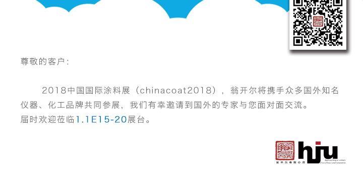 2018中國(guó)國(guó)際涂料展(chinacoat2018),翁開爾將攜手眾多國(guó)外聞名儀器、化工品牌共同參展,我們有幸邀請(qǐng)到國(guó)外的專家與您面對(duì)面交流。屆時(shí)歡迎蒞臨1.1E15-20展臺(tái)。